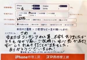スマホ修理工房ジョイナステラス二俣川店・iPhone6の画面交換でお越しのお客様から頂いた口コミ