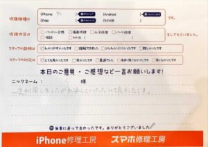 【iPhone5s 画面交換でご来店のぐ様から頂いたコメント】