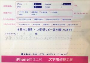 スマホ修理工房ジョイナステラス二俣川店/iPhoneSEのバッテリー交換でお越しのお客様から頂いたお言葉