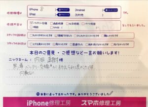 【iPhone7 バッテリー交換でご来店の内田直樹様から頂いたコメント】