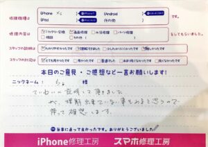 【iPhonXS 画面交換バッテリー交換でご来店のちょ様から頂いたコメント】