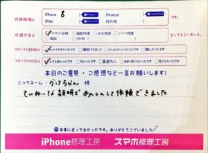 スマホ修理工房ジョイナステラス二俣川店・iPhone8のバッテリー修理でお越しのお客様からいただいたお言葉