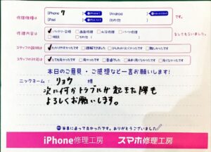 スマホ修理工房ジョイナステラス二俣川店・iPhone7のバッテリー修理でお越しのお客様からいただいたお言葉